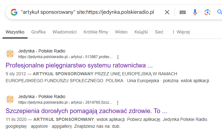 Artykuły sponsorowane publikowane na stronie tej stacji także nie posiadają linków z atrybutami nofollow ani sponsored.