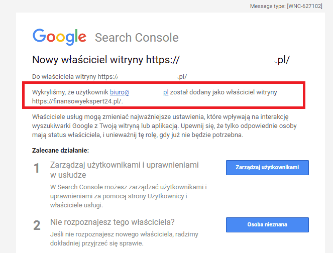 W świetle powyżej przedstawionych informacji zdecydowanie zalecam dodawanie firmy SEO nie jako właściciela, ale jako użytkownika z dostępem pełnym; dodanie użytkownika z takim dostępem skutkuje otrzymaniem przez niego poniższej wiadomości na email, na który przydzielono dostęp