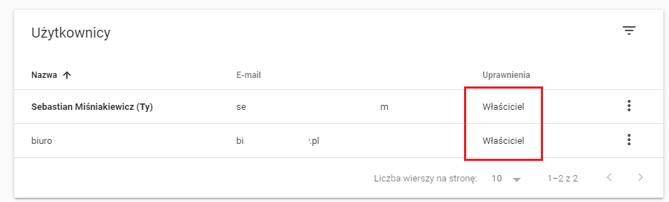 Właścicielem ma być tylko właściciel domeny, pozostali mają mieć najwyżej dostępy pełne – jeżeli obecna firma SEO ma dostęp właścicielski, należy to zmienić, usuwając ją jako właściciela, a przyznając jej w zamian dostęp pełny. I wtedy już bez problemu możemy innej firmie przydzielić też dostęp (ograniczony lub pełny), aby mogła dokonać analizy działać firmy, co do której mamy wątpliwości