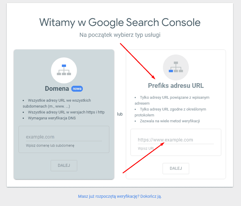 Aby nadawać uprawnienia trzeba stać się najpierw właścicielem domeny – dlatego jeżeli nie jesteśmy jeszcze zweryfikowani w Search Console jako właściciel musimy to szybko ustawić.