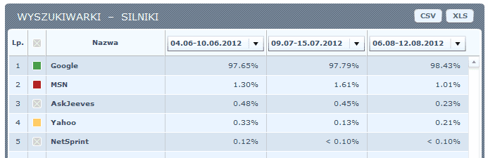 I jeszcze jedna rzecz. Ci, co narzekają, nie szczędzą słów krytyki pod adresem Google. Zapytam się – a po kiego czorta wyszukują informacje w Google? Przecież jest tyle innych wyszukiwarek na świecie. Przytoczę może dla nich suche dane statystyczne, obrazujące udział w polskim rynku wyszukiwarek najpopularniejszych silników. Wybrałem do porównania okresy z początku czerwca, lipca oraz sierpnia 2012. Na czerwono zaznaczyłem Google. Zwracam uwagę na trend w udziale rynkowym (jeszcze bardziej widoczny, jak na stronie pozostawi się domyślne trzy ostatnie okresy) – i pozostawiam to bez komentarza.