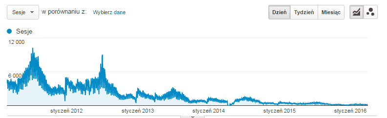 Poniższy wykres, przedstawiający ilość dziennych wejść na stronę z naturalnych wyników wyszukiwania w Google, pokazuje dobitnie, co się stało ze stroną: