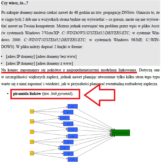 Ponadto analizując udostępnione printscreeny kursu natykamy się m.in. na piramidę linków – jest to pojęcie stricte nienaturalne z punktu widzenia Wskazówek Google dla Webmasterów