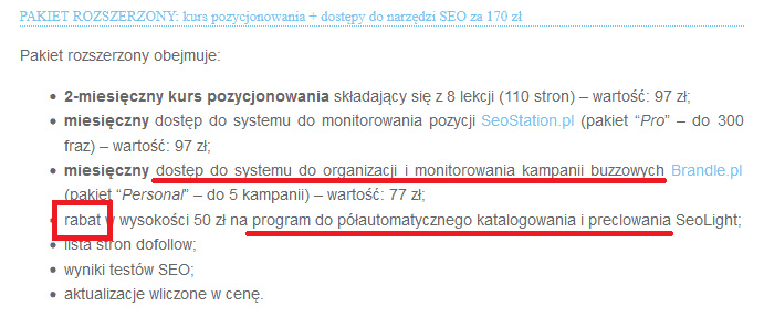 Zauważmy, że jednocześnie jako gratis oferowany jest program do propagowania spamu – półautomatyczne katalogowanie oraz preclowanie na pewno nie odpowiadają za naturalne linkowanie. Pytanie – czy Klient źle „zrozumiał kurs”? Czy może sprzedano mu coś, co rzeczywiście miało być sposobem na naturalne pozycjonowanie?