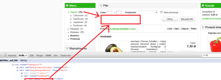 Dokładnie nagłówek H1 „Owoce” wyświetla się przed słowem Sortuj (w tej samej linii) class=”boxhead”