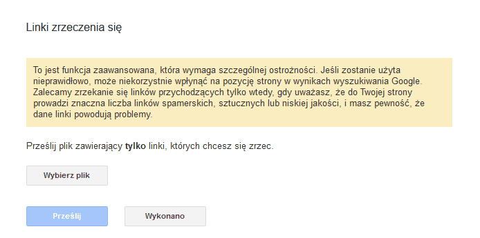 Po kliknięciu w przycisk „Linki zrzeczenia się” przechodzimy już do ostatnie karty, poprzez która wgrywamy nasz stworzony plik tekstowy disavow.txt