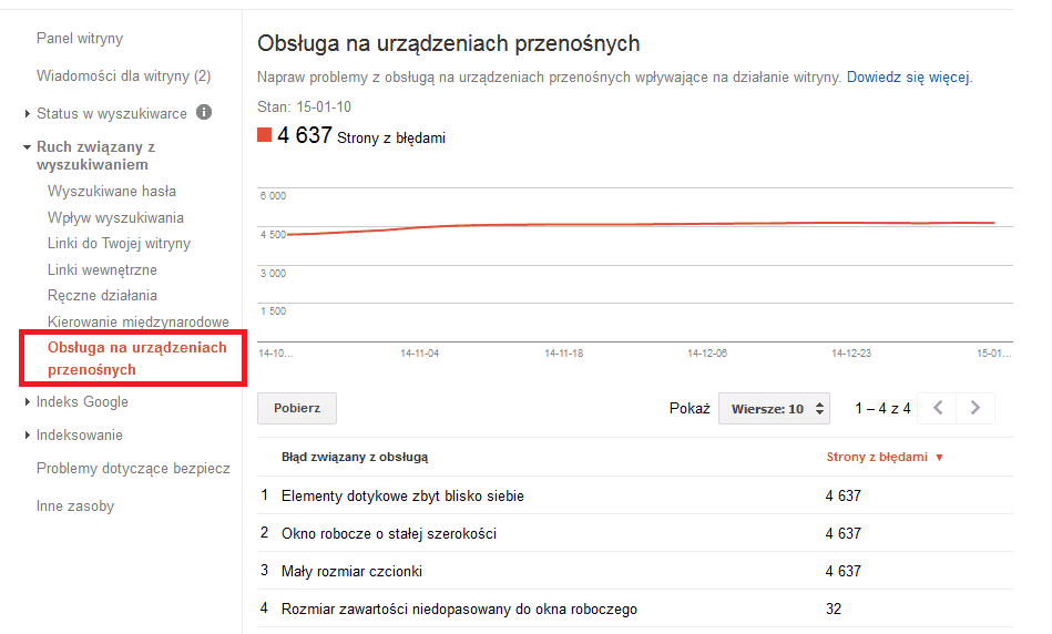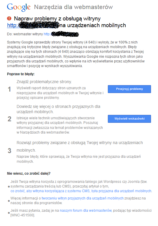 Pierwszy przycisk – „Przejrzyj problemy” – przenosi nas od razu do odpowiedniej sekcji w Narzędziach dla Webmasterów, gdzie możemy sprawdzić, które ze stron wymagają naszej uwagi