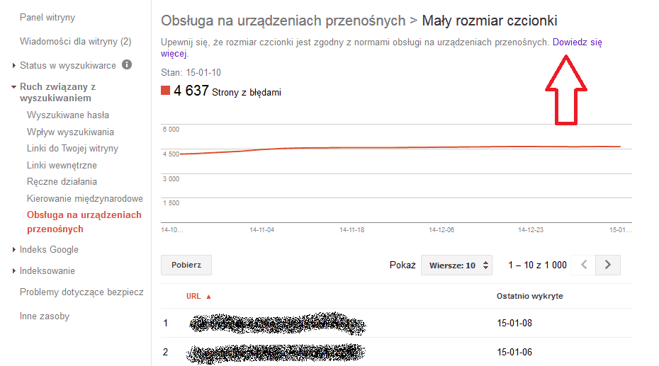 W analizowanym przypadku mamy cztery rodzaje problemów. Klikając w link przechodzimy do szczegółów danego problemu – np. po kliknięciu w „Mały rozmiar czcionki” przechodzimy do nowej strony, na której nie tylko widzimy listę problematycznych stron, ale także otrzymujemy konkretne wskazówki odnośnie poprawy problemu określonego przez Google jako „Mały rozmiar czcionki”