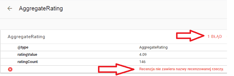 Analizując w kolejnym kroku niestandardowe strony okazało się, że na jednej z nich była zaimplementowana ocena (AggregateRating) – w sposób, który nie tylko nie pokazywał jej na stronie, a co za tym idzie nie pozwalał na głosowanie.