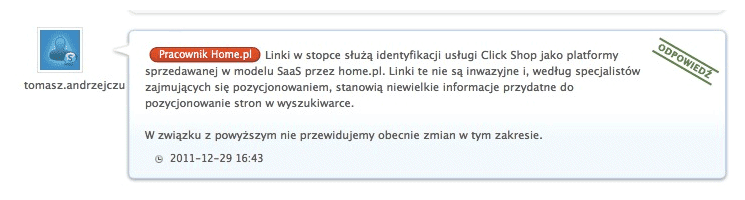 Wydaje mi się, że to jest conajmniej nie w porządku, ponieważ za pomocą tej techniki, home.pl pozyskuje linki z tysięcy domen które automatycznie mają doklejaną taką stopkę.Samo podzielenie tekstu „sklep internetowy Click Shop” na dwa fragmenty, jest ewidentnym zabiegiem seo mającym dostarczyć home dużą ilość linków na pierwszy fragment, jako trudniejszą do „pozycjonowania” frazę.Jeśli linki te są dodawane w celach opisanych w regulaminie, home.pl powinno dodać tam nofollow i nie wykorzystywać trików z osobnym linkowaniem „sklep internetowy”.Sprawa przypomina problemy wpmu.org które przy ostatniej aktualizacji google straciło masę ruchu, ponieważ google zdewaluował ich linki załączane w stopce darmowych skórek do WP.W mojej opinii google powinno się tym zająć bo zachowanie, z punktu widzenia klienta, jest kompletnie nie fair. Nie ma żadnej możliwości z poziomu panelu sklepu, usunięcia tych linków.