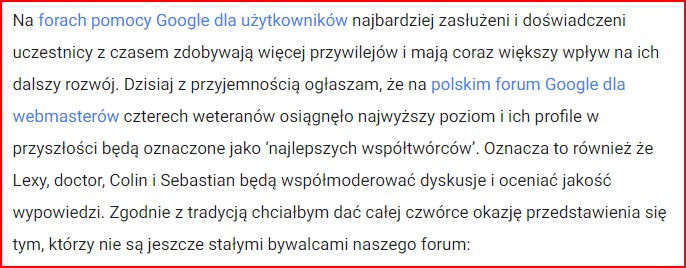 Czas biegnie nieubłaganie – 10 lutego 2011 roku, czyli równe 10 lat temu, zostałem pierwszym moderatorem oficjalnego Forum Google dla Webmasterów.