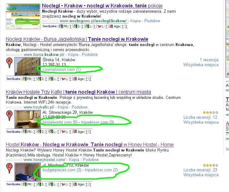 Wraz z nową prezentacją wyników wyszukiwania w Google, związaną z przeniesieniem mapek do tej części strony, która do tej pory była niejako zarezerwowana tylko dla SERPów, da się zauważyć pod wpisami opinie pochodzące ze znanych serwisów tematycznych.