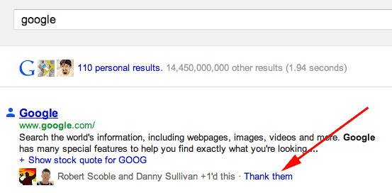 Just like you would thank a friend in person for giving you a helpful recommendation, now if a friend’s +1 helped you find what you were looking for while searching on Google, you can immediately thank him or her by clicking the „Thanks” link right in your search results and writing a quick message. When your friend signs in to Google+, your thanks will appear in his or her stream. We’re continuing to try out new ways you can interact with the people you care about right on the results page.
