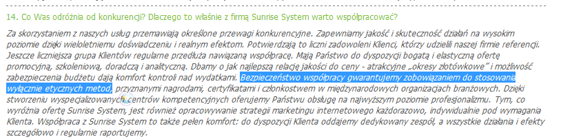 Witam, Współpracowałem z Sunrisesystem przez prawie rok. W tym czasie nie zanotowałem wzrostów pozycji strony a wręcz spadki. Zaraz po rozpoczęciu współpracy stan inedeksowania strony widoczny w Search Console spadł o 35% i nie podniósł się przez rok współpracy. Nikt z SS nie potrafił mi tego wyjaśnić. Zaraz po złożeniu wypowiedzenia parametry strony w Search Console spadły o następne 30%. Na szczęście wszystko mam na sceenach. Zdecydowanie odradzam współpracę z tą firmą choć trzeba przyznać, że marketing i ludzi na sprzedaży usługi mają świetnych.