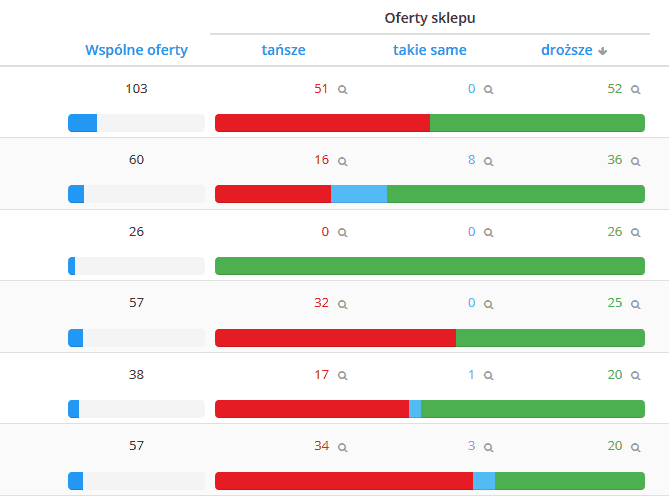 Gdy ogarniemy już największe „wpadki” warto zwrócić uwagę na to, z kim konkurujemy i na jakich zasadach – program pobiera loga konkurencyjnych sklepów (wyciąłem je z grafiki) i informuje nas, czy jesteśmy na tle konkurencji tani, drodzy – lub czy nasze produkty oferujemy na tym samym poziomie cenowym