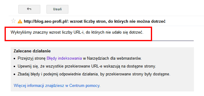 Oczywiście wiadomość nie przyszłaby na email, gdybym wcześniej go nie ustawił w Panelu. Po raz kolejny gorąco zachęcam do zdefiniowania w Narzędziach adresu email powiadomień – dzięki temu jak coś się dzieje złego ze stronami dostajemy o tym informację zaraz po jej wysłaniu przez Google. Zyskujemy czas – nie musimy co chwilę logować się do Narzędzi w celu sprawdzenia kondycji naszej strony.